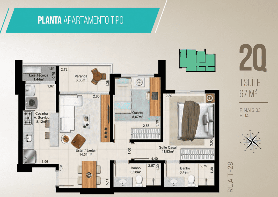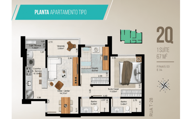 2 Quartos - 67 m²
